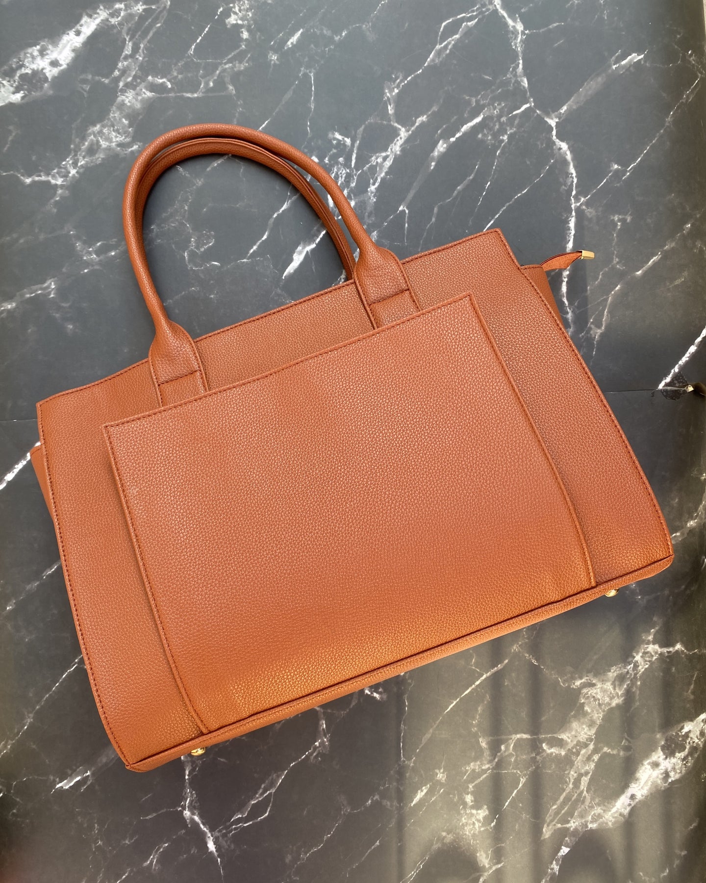 Designed to fit laptops up to 15.6 inches, this tote features a spacious interior with multiple compartments to neatly organize your laptop, charger, documents, wallet, and daily essentials. Crafted with a premium vegan-leather finish, it offers durability while remaining lightweight and comfortable for all-day wear.